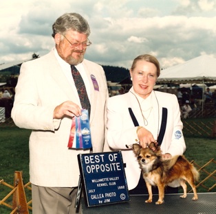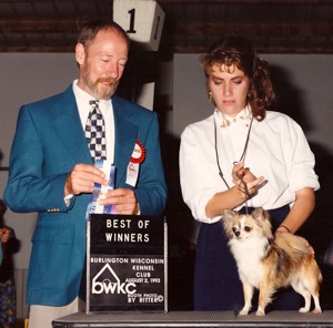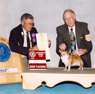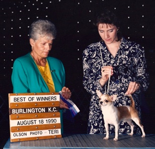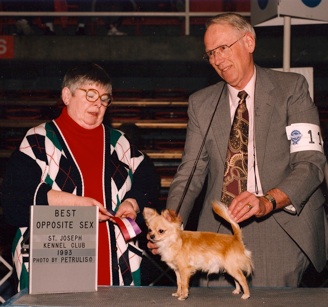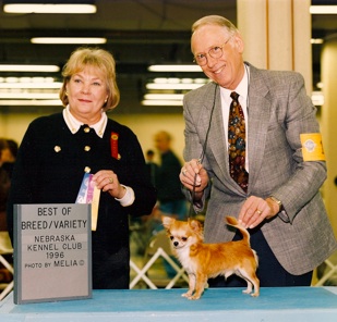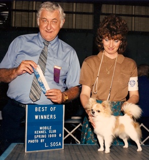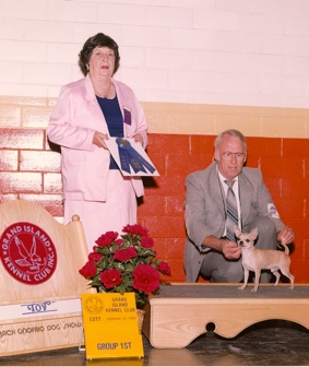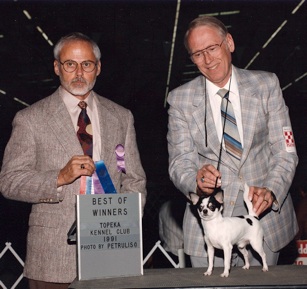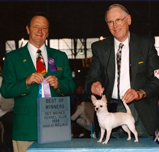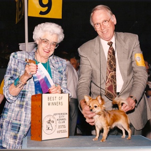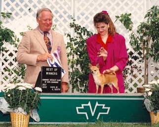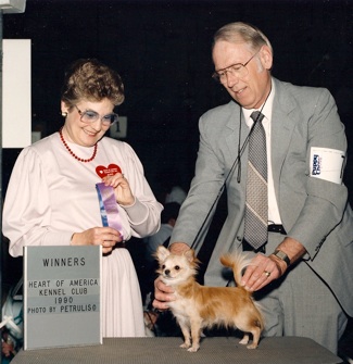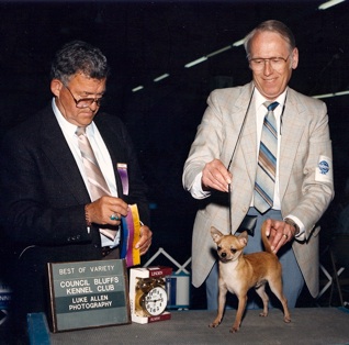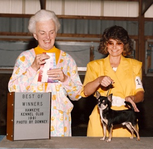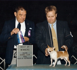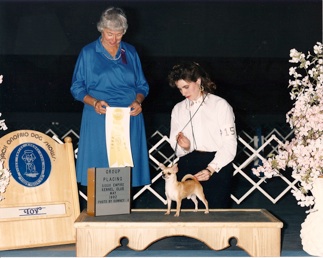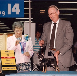 Ch. Hurd’s Barbary Coast, littermate to Ch. Peach Delight, pictured going WD at the Oklahoma Chihuahua Specialty under judge Edd Bivin. Later owned by Margaret Kyle.