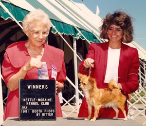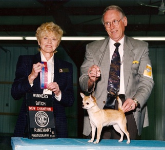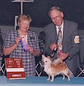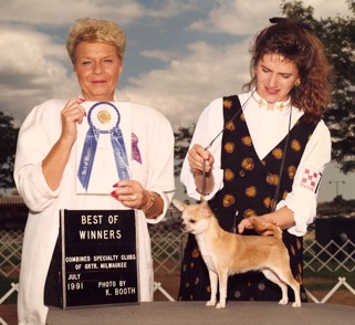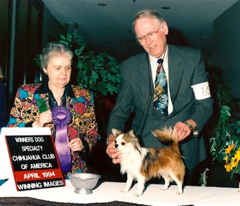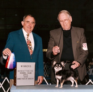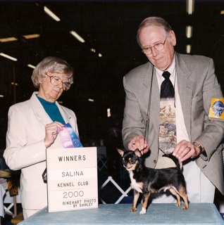 Ch. Hurd’s Opie Punk pictured winning at the Dallas Chihuahua Club under breeder-judge Carolyn Mooney. Sired by Ch. Dartan Go For The Gold X Ch. Hurd’s Gingersnap.