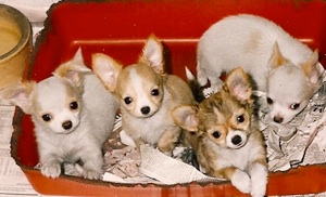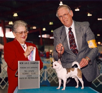 Littermates Ch. Hurd’s Toby the Tomkat and Ch. Hurd’s Peach Fuzz, sired by Ch. Ouachitah Beau Chiene X Ch. Hurd Thru the Grapevine. Toby is pictured winning WD at the Chihuahua Club of America National Specialty under breeder judge and author E. Ruth Terry. Peach Fuzz is pictured finishing to championship under judge Dawn Vick Hansen.