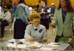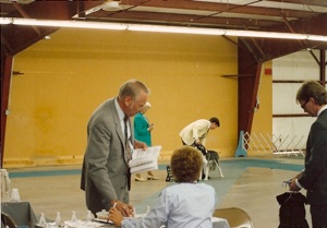 Max and Gerry Hurd ring stewarding at the Council Bluffs Kennel Club Show. Max is a charter member of CBKC which was founded in the late fifties. Gerry joined shortly after they were married in 1985.