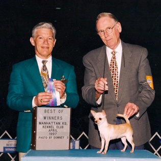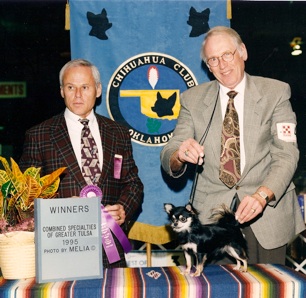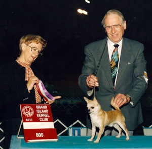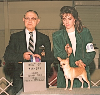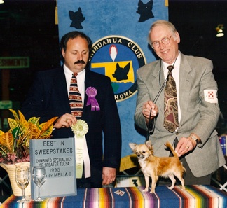 Ch. Hurd’s Batam Chic, bred, owned and handled by Max E. Hurd winning Best in Sweepstakes at Chihuahua Club of Oklahoma Specialty. Later owned by Tori Roemer.