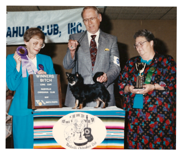 Ch. Hurd’s Black Habit II pictured going WB at the Nashville Chihuahua Specialty under breeder-judge Carolyn Mooney. Owned and handled by Max E. Hurd. Bred by Jackie Brink.