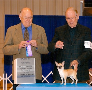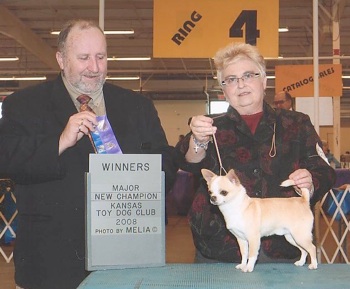Ch. Hurd’s Bentley at Harmony (Hurd’s One Tuff Tiger X Hurd’s Kiss of Kaila) pictured winning a 5 point major on the Sunflower Cluster to finish to his championship. He was also BOS to Best Puppy in Sweepstakes at the Land of Lincoln Chihuahua Specialty under judge Mryle Hale.