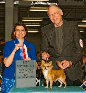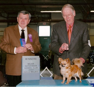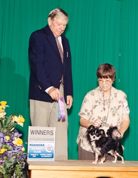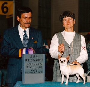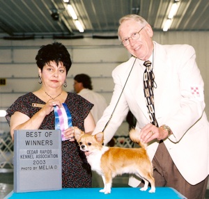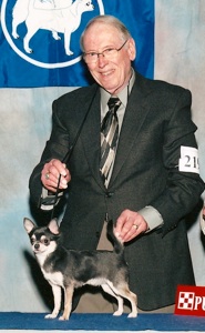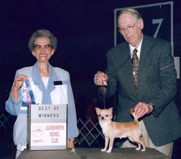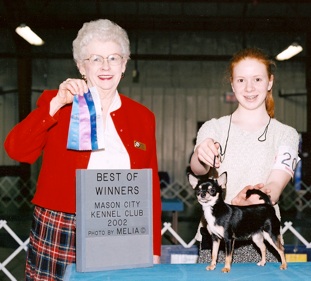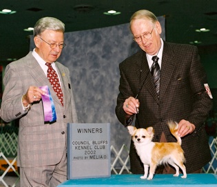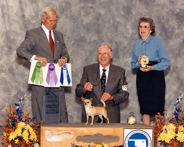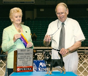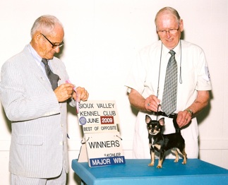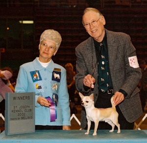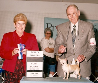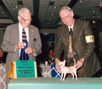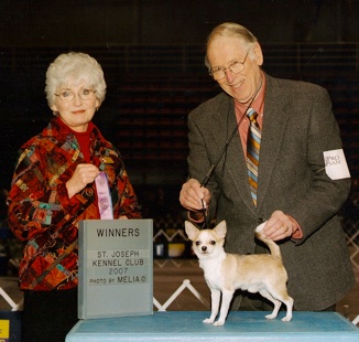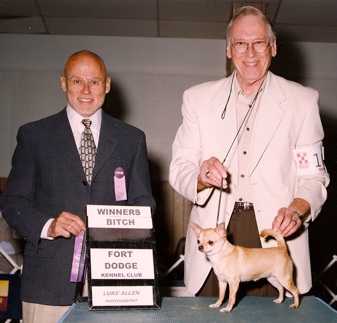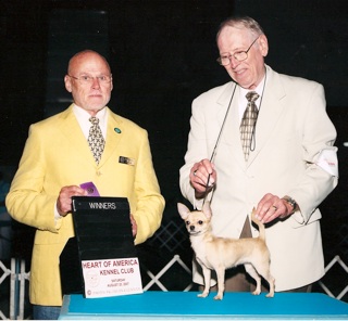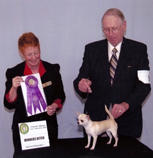 Ch. Hurd’s Peggy Sue sired by Ch. Hurd’s Prom Knight X Hurd’s Kissimee Kate first (left) pictured winning Best Puppy In Sweepstakes at the Land of Lincoln Chihuahua Specialty long time breeder judge Myrle Hale. She then went on to be WB and Best Bred By Exhibitor In Show at the CCofA National Specialty under judges Peggy A. Hogg and Edd Bivin. She was also RWB the previous day at the Nashville Chihuahua Specialty.
