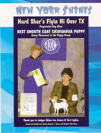 Ch. Hurd-Shar’s Flyin Hi Over TX (Ch. Hurd’s Prom Knight X Hurd’s My Fair Lady). bred by Max E. Hurd and Co-owned and handled by Sharon Massad. Pictured placing in Puppy Toy Group at the Progressive Dog Show and then finishing to championship in Texas. Now owned by Sharon Massad.