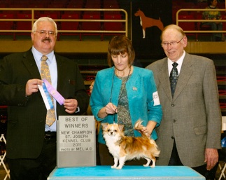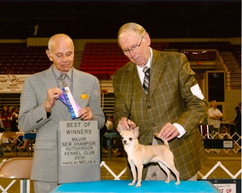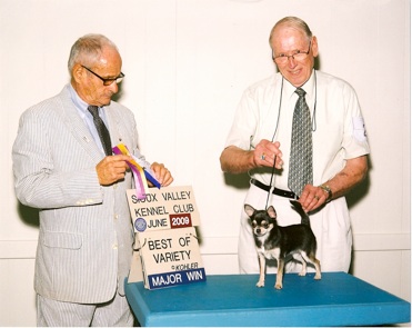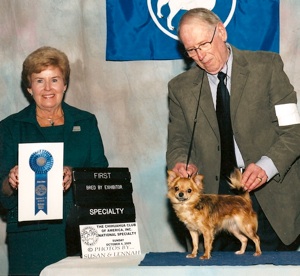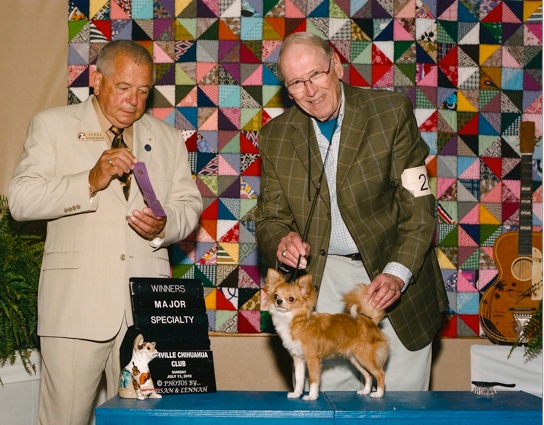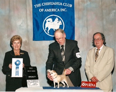 has had to discontinue breeding and showing Chihuahuas. We are still very good friends and I truly miss our past joint activities with the Chihuahuas. I am currently showing Hurd’s Q-Tee Fancy, one of the last puppies Sherry bred. I wish to thank Sherry for letting me have “Fancy” and know Fancy made her proud by winning a five point major at the Nashville Chihuahua Club Specialty from the puppy class under breeder judge Richard Miller. She is sired by Ch. Hurd’s Q-Tee Silver Moon X Cinco-C Anna Moke Supreme.